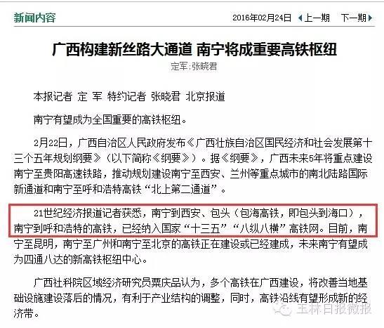 21世纪经济报道记者获悉,南宁到西安、包头(包海高铁,即包头到海口),南宁到呼和浩特的高铁,已经纳入国家“十三五”“八纵八横”高铁网。