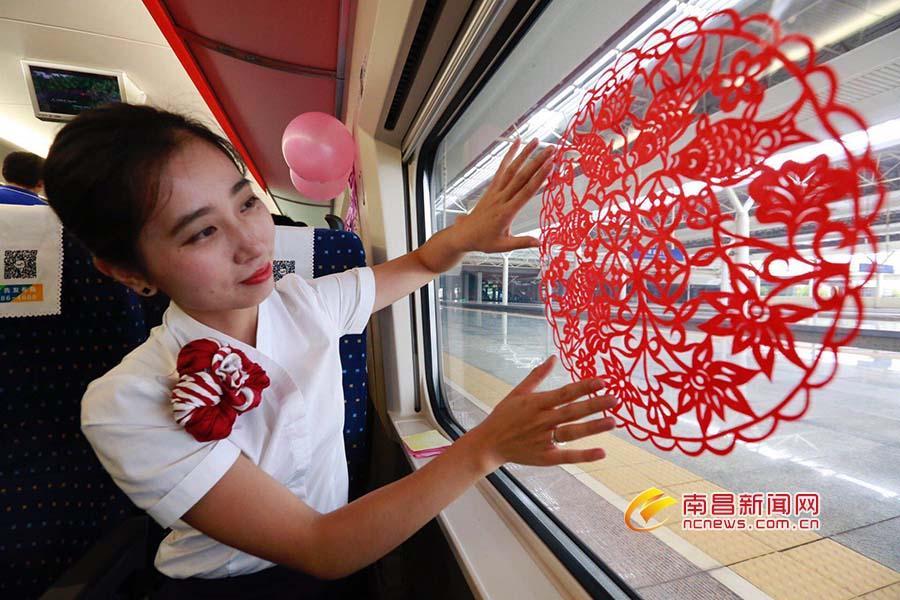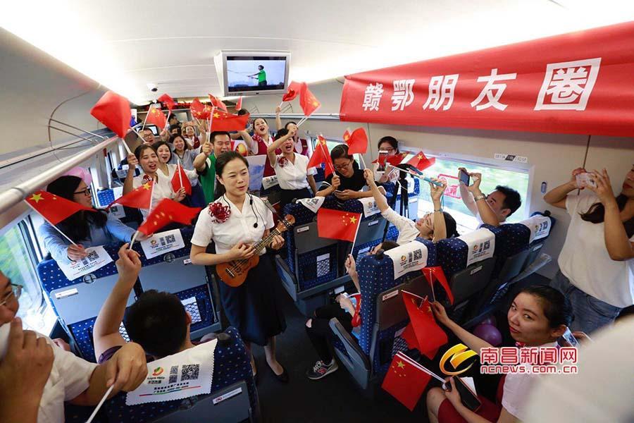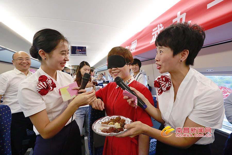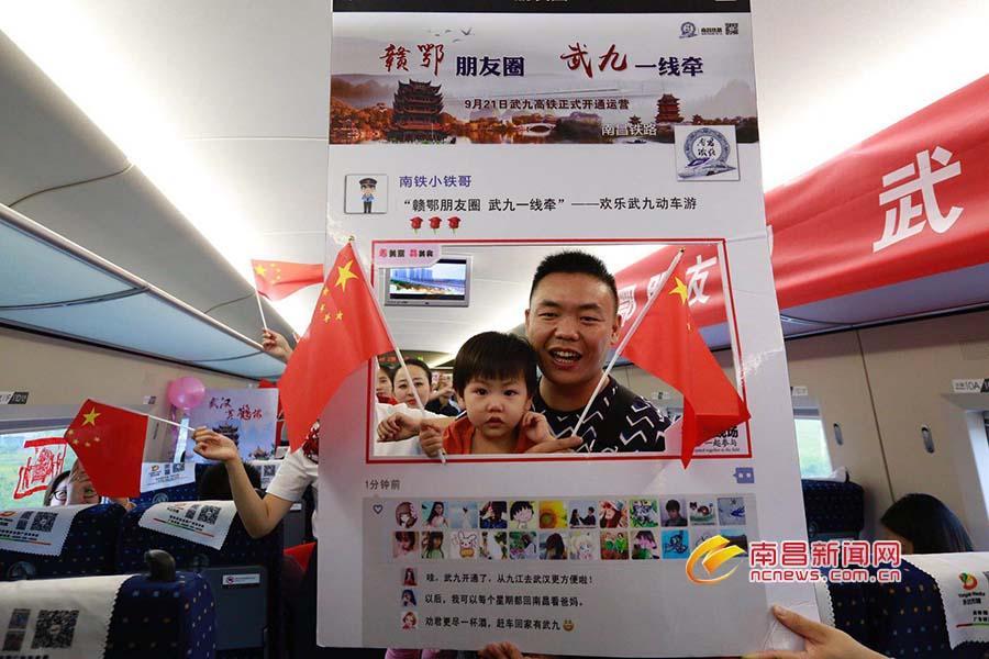 列车员和旅客一同庆祝武九高铁开通