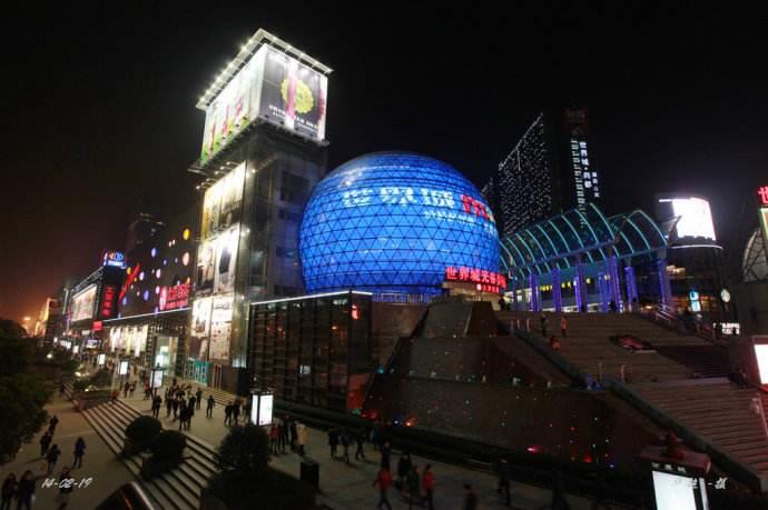 这个大洋百货的“大圆球”已经成为光谷最突出的标志物了,圆球下的一长条楼梯,每逢天气清爽,晚上就会坐着人们在这里欣赏夜景。这个就是世界城光谷步行街一期现代风情街。