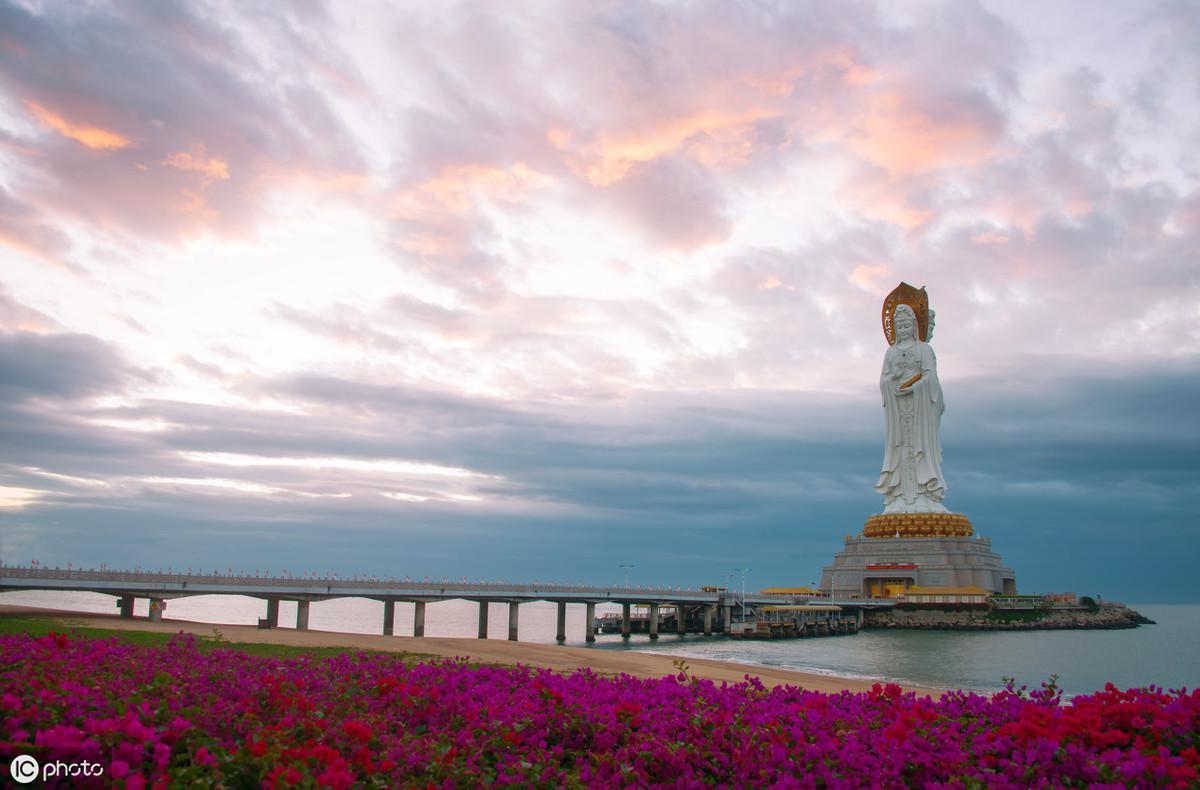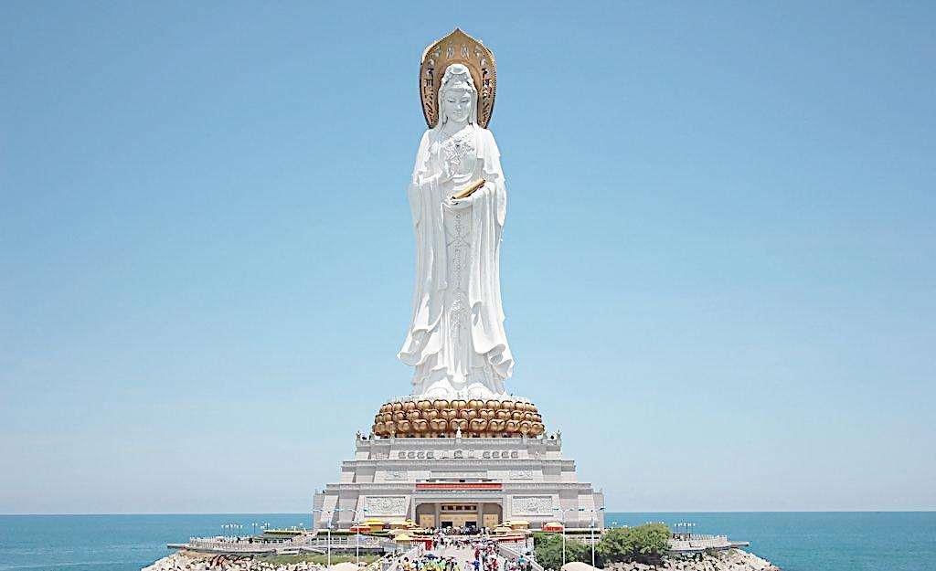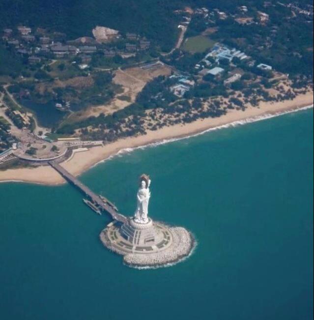 三亚的海上观音圣像,108米高,一体化三尊,巍峨壮观,实乃世界造像之最。观音圣像一面是手持莲花,另一面是手持经书,还有一面是手持佛珠。