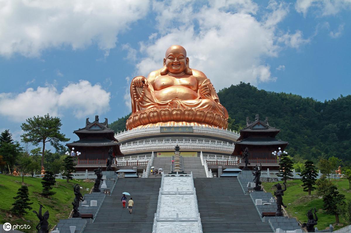 这是以奉化布袋和尚基本形态为造型的中国化弥勒佛像。大佛坐北朝南,为铜质坐姿,左手提布袋,右手握佛珠,慈眉善目,笑容可掬,袒胸露腹。像身高度33米,莲花座:高9米,是中国境内室外最大的弥勒佛。