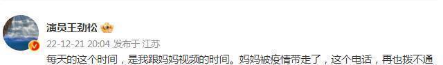 12月21日晚,演员王劲松在社交平台宣布这一悲伤消息,配文:“此时,我和妈妈视频时间。疫情带走了妈妈,这个电话再也打不通了。”