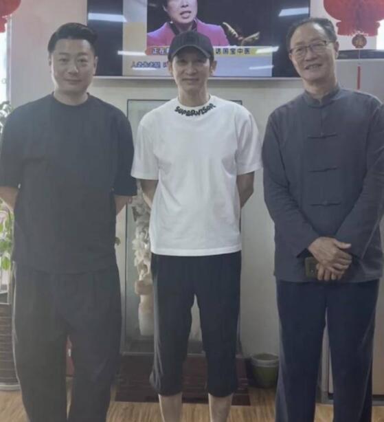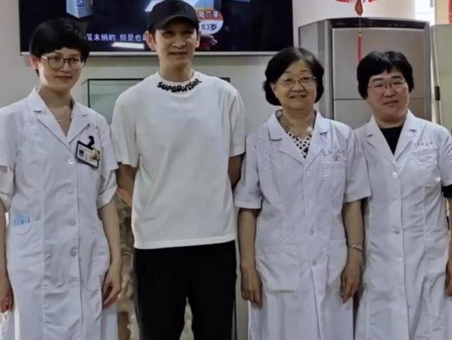 王劲松没有明星,他亲切地和医护人员合影,他很友善,王劲松多次来回为母亲的病取药,非常童趣。