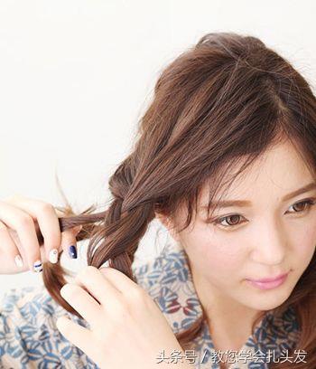 第二步:将右边发量多的一侧刘海与耳朵附近的发丝编织成松散的麻花辫。如图所示。