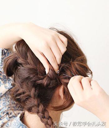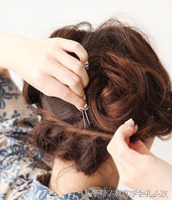 第五步:左边耳朵前方的发丝扭转成发辫,向后拉穿过脑后,用发卡固定在右边耳朵的后方。如图所示。