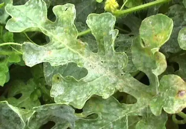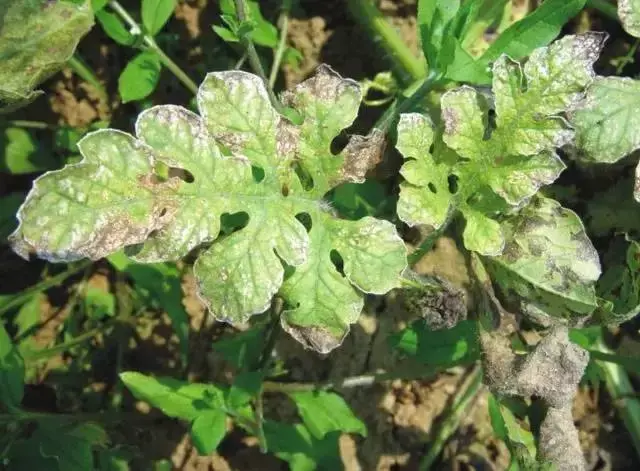 瓜苗染病:沿叶片中脉出现不规则褐色病斑,有的扩展到叶缘,叶背面呈水浸状。