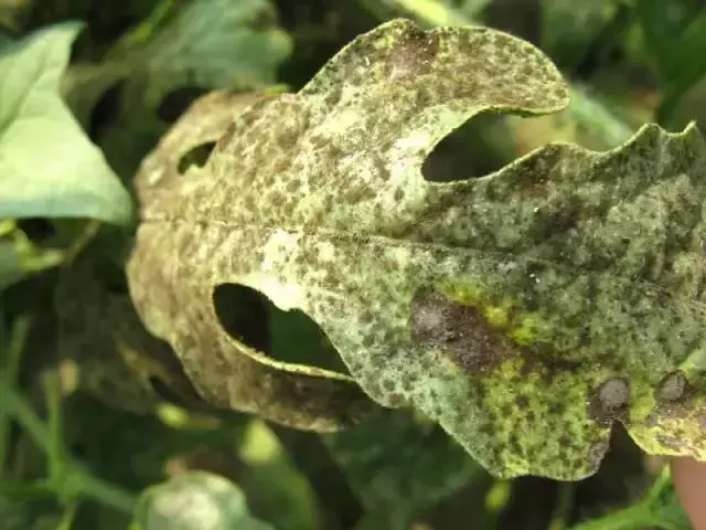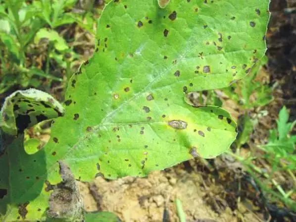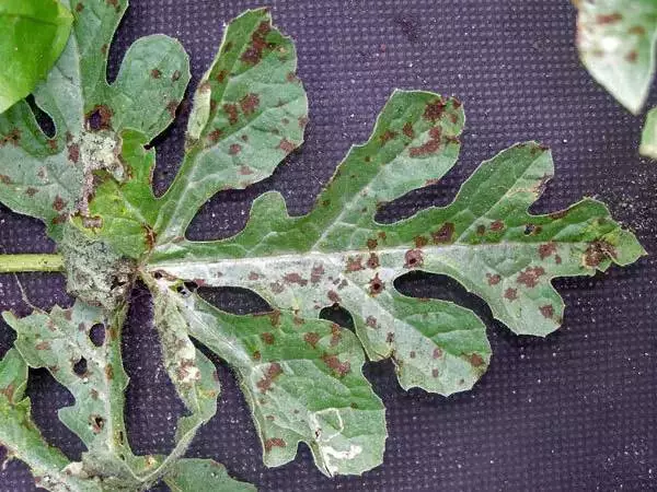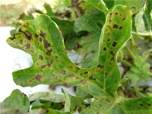 叶片染病:初生水浸状小斑点,分布在叶缘或叶脉间,后扩展为圆形至近圆形暗褐色,边缘稍隆起,病健交界处明显,上具不大明显轮纹,病斑迅速融合为大斑,致叶片枯黄;湿度大时病斑扩展迅速,致全株叶片枯萎。该病茎、蔓不枯萎,别于西瓜蔓枯病和枯萎病。