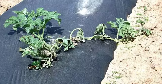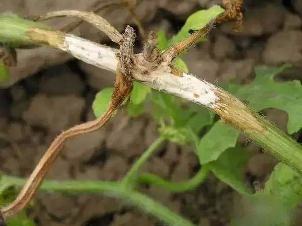 成株染病:生长缓慢,叶片自下向上逐渐萎蔫,似缺水状,早晚可恢复,几天后全株叶片枯死。枯萎的茎蔓基部表皮粗糙,根茎部纵裂,潮湿时呈水渍状腐烂或出现琥珀色流胶,产生粉红色霉层。剖开根或茎蔓,可见维管束变褐,腐烂,易拔起。