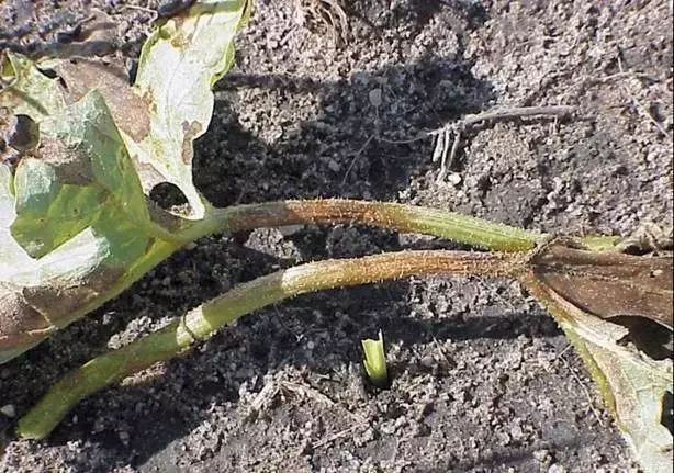 叶柄或茎蔓染病:出现狭长、褐色、水渍状冰痕,稍凹陷,环绕茎蔓一周全株即枯死。