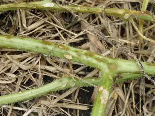 茎部染病:病部出现暗褐色纺锤形水浸状斑,病情扩展快,茎变细产生灰白色霉层,致病部枯死。蔓的先端最易被侵染,导致侧枝增多,在低洼处的蔓尤为明显。