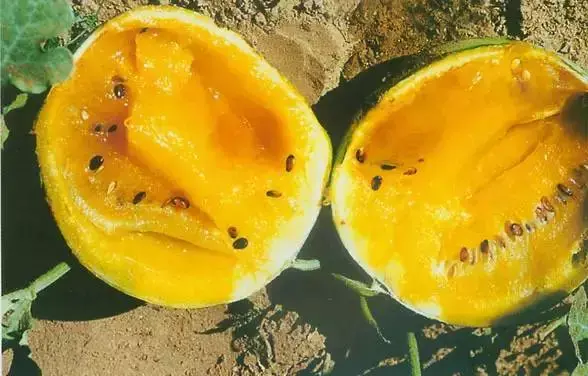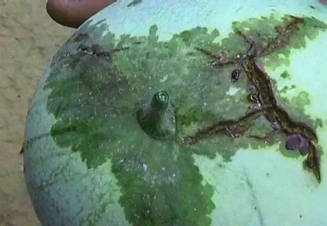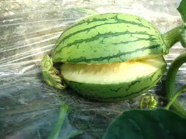 西瓜裂瓜是西瓜采收前,瓜从花痕外自然开裂。生产上小西瓜较大西瓜裂瓜现象严重,大西瓜中果皮薄的品种也有时发生,多发生在生长后期至采瓜前,常表现为横向或纵向不规则开裂,有的从花蒂处龟裂。