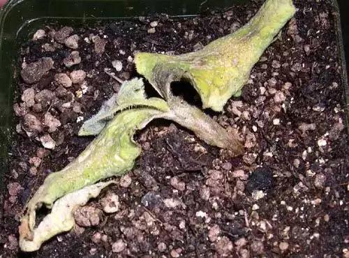 幼苗茎基部受害:呈暗绿色水渍状软腐,病部缢缩,最后猝倒枯死。