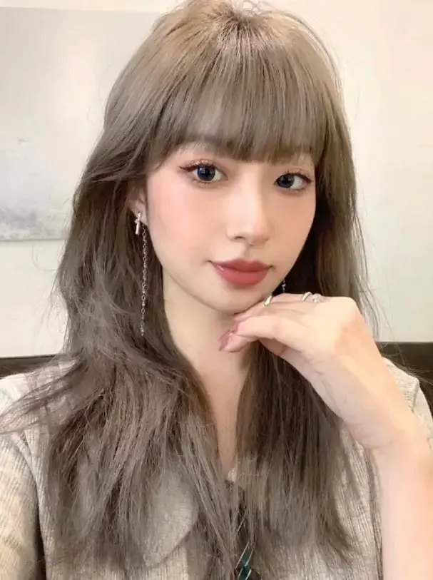 轻薄的空气烫刘海,很好遮掩了高发际线、宽额头的问题,两侧的头发还对高颧骨进行修饰,最后染上烟熏米灰色,肌肤都白了好几个度。