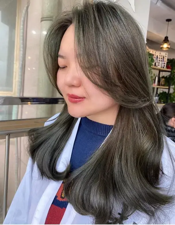 3、夏天那么热,除了可以靠减少衣物来得到凉快时,你还可以尝试下给自己选择在视觉上“降温”的颜色。例如染上一个冷色系的发色就是很不错的选择,而最近流行的“烟熏米灰色”刚好能符合你的要求,这种偏冷调的发色,看似有些难驾驭,实则很不挑人!搭配长发气垫烫发型,再剪了个中分八字刘海,大脸、圆脸也可以很瘦。