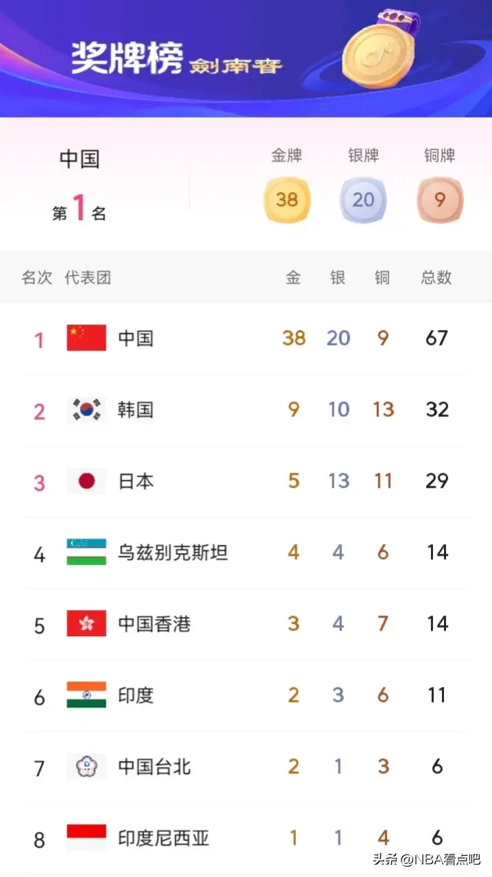 亚运会金牌榜最新更新!中国队38枚金牌遥遥领先!朝鲜第13