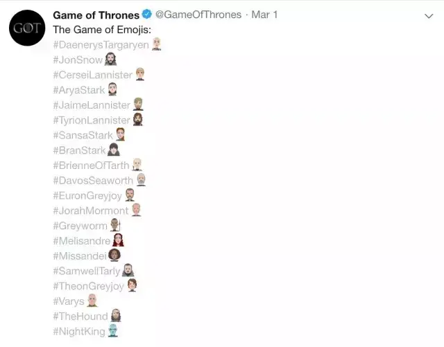 发布海报的同时,20个人物对应的emoji也同样释出,可爱的造型与坐在铁王座上的严肃完全两样。