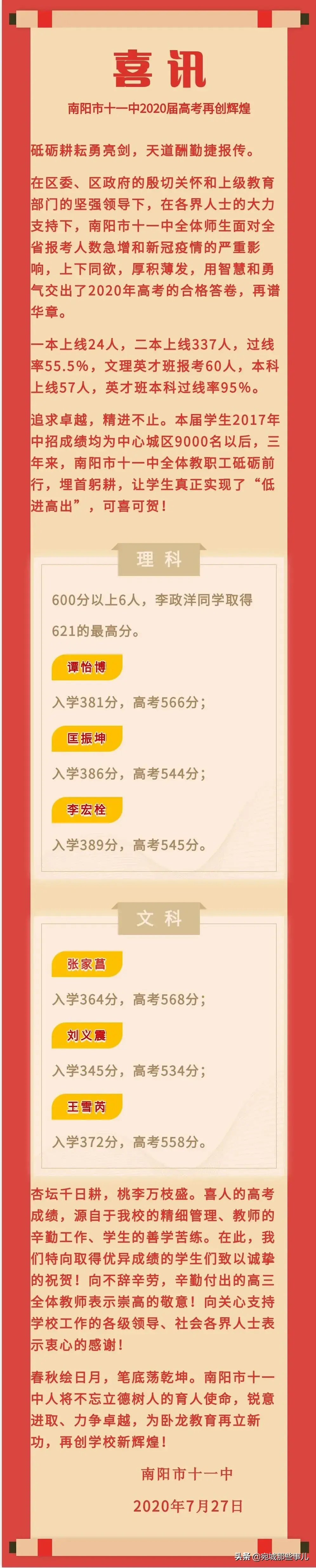 文科钟毅清以总分678分的成绩夺得全省第二名,南阳市第一名。理科于博以总分713分成绩位居全省第17名。理科690分以上9人,650分以上127人,600分以上617人。文科650分以上4人,600分以上93人。文理科600分以上710人。一本进线1970人,进线率61.5%;本科进线3138人,进线率97.97%。