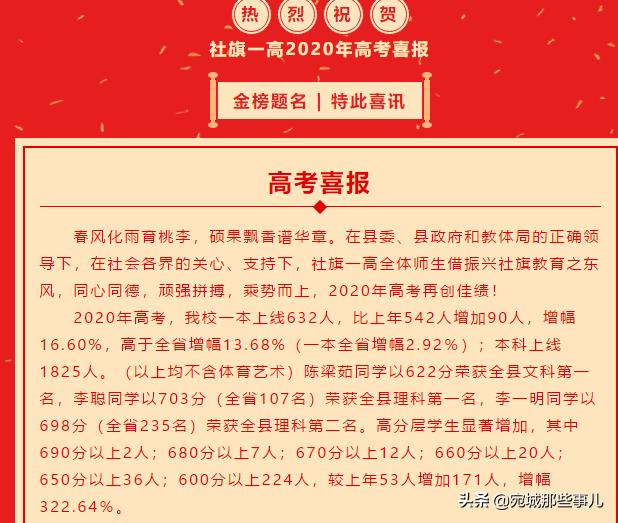 2020年高考,该校一本上线632人,比上年542人增加90人,增幅16.60%,高于全省增幅13.68%(一本全省增幅2.92%);本科上线1825人。(以上均不含体育艺术)陈梁茹同学以622分荣获全县文科第一名,李聪同学以703分(全省107名)荣获全县理科第一名,李一明同学以698分(全省235名)荣获全县理科第二名。高分层学生显著增加,其中690分以上2人;680分以上7人;670分以上12人;660分以上20人;650分以上36人;600分以上224人,较上年53人增加171人,增幅322.64%。