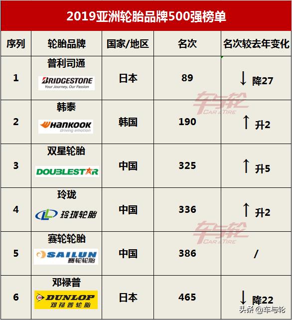 亚洲品牌500强:普利司通、韩泰、双星、玲珑、赛轮、邓禄普