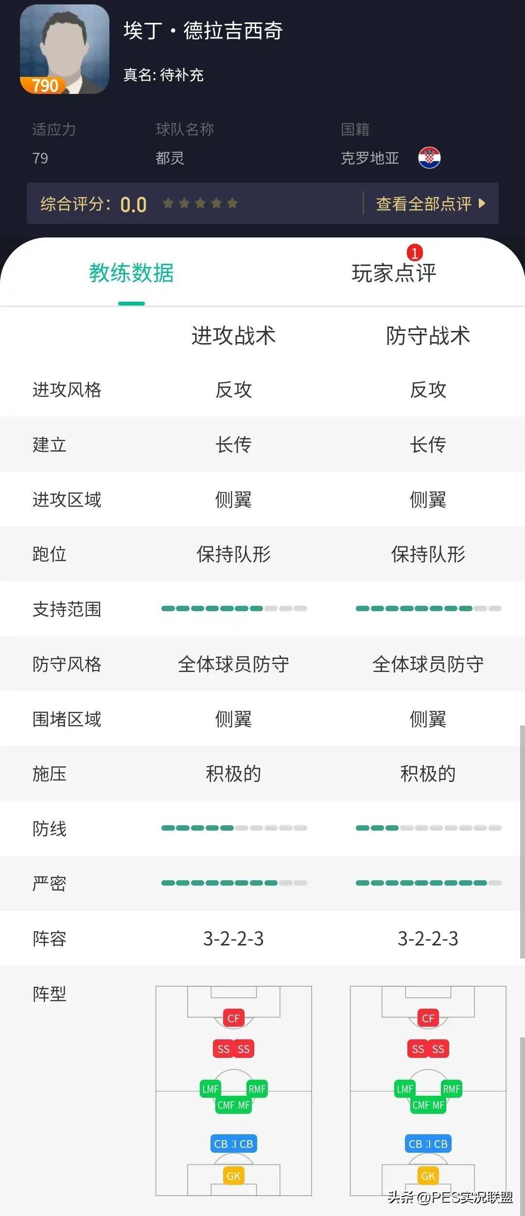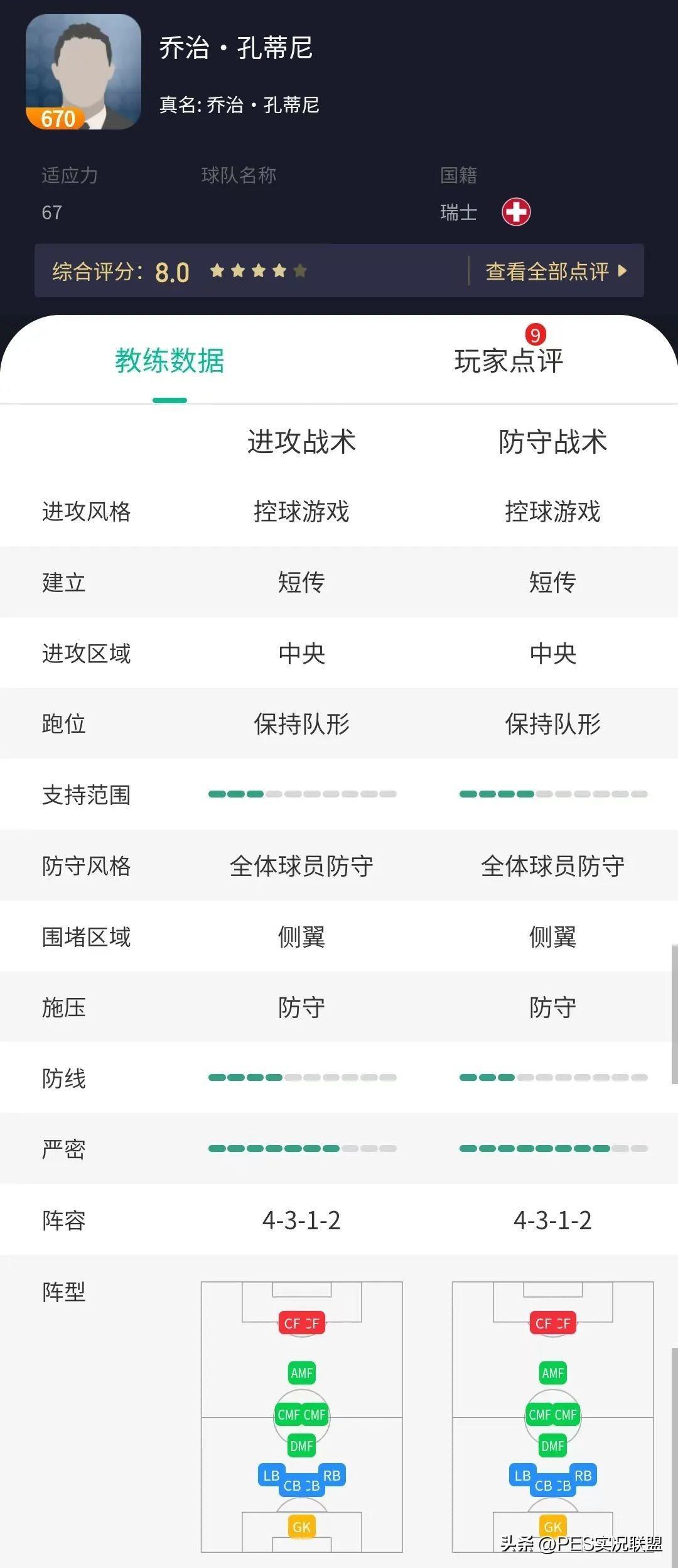 他的另外一个特点是严密程度较高,阵型收缩得相对紧密,且中卫线前倾程度较低,好处是中路不容易被打穿,但弊端是边路容易暴露出空挡。因此大家选择他作为教练时,需要仔细斟酌这种特点是否自己的惯用打法。