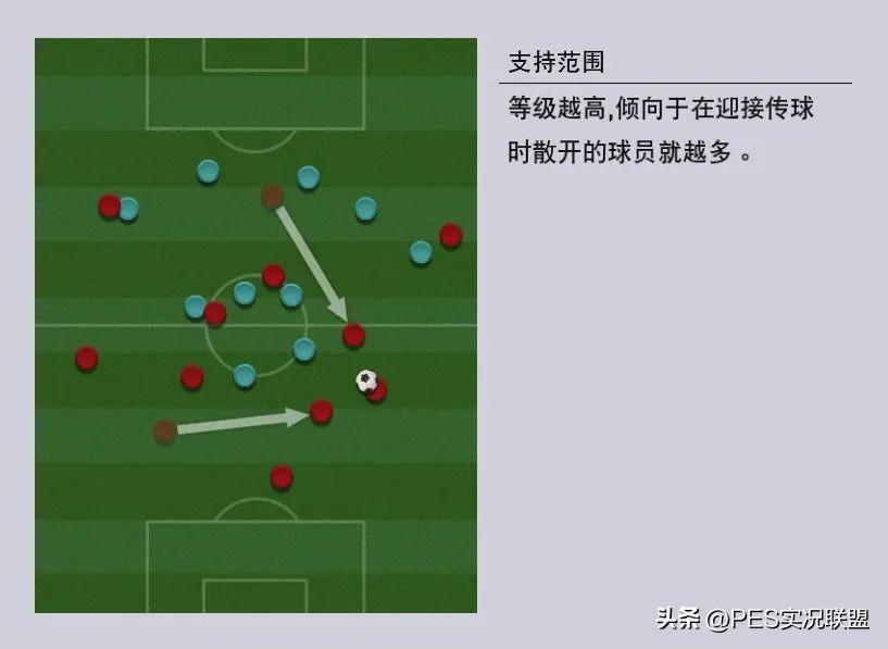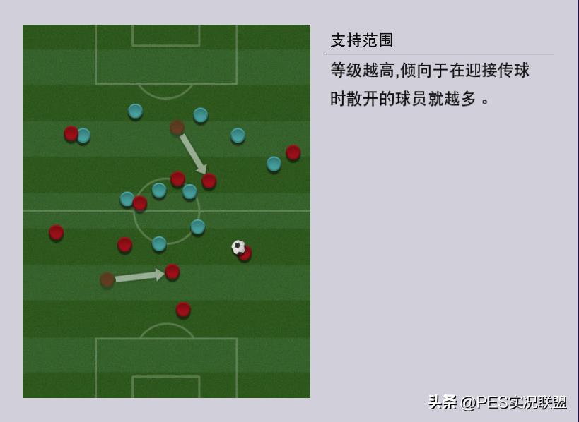 一是支持范围极高,迎接传球时散开的球员更多(如下图所示,左侧支持范围1,右侧支持范围10),更利于反击。