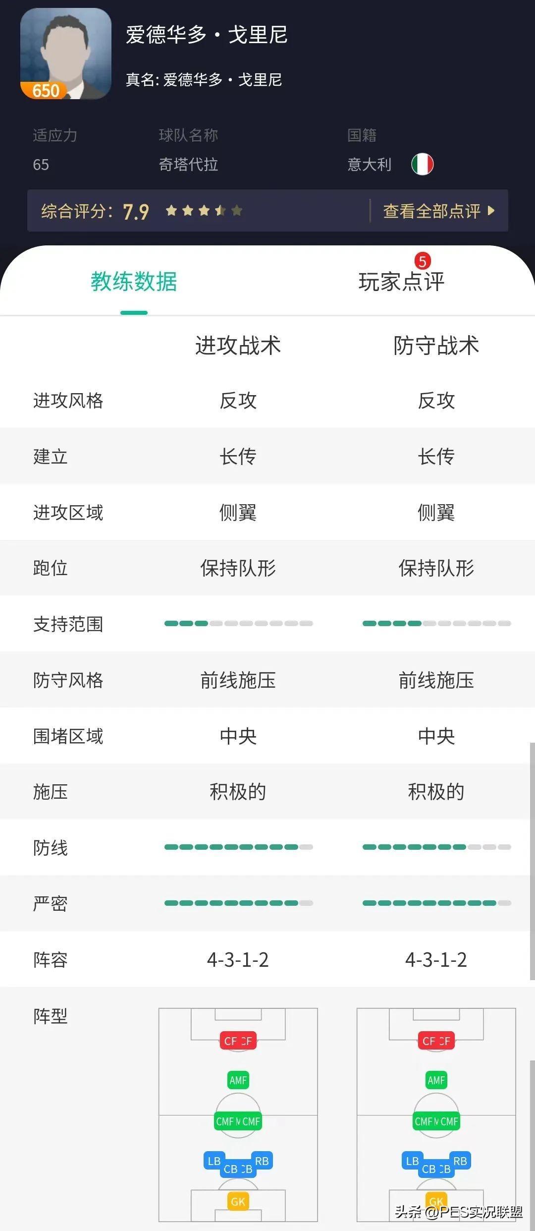 戈里尼的防线等级是9,这也就意味着他的球队是依靠密集阵型和高位逼抢,压在对方的半场进行反击。