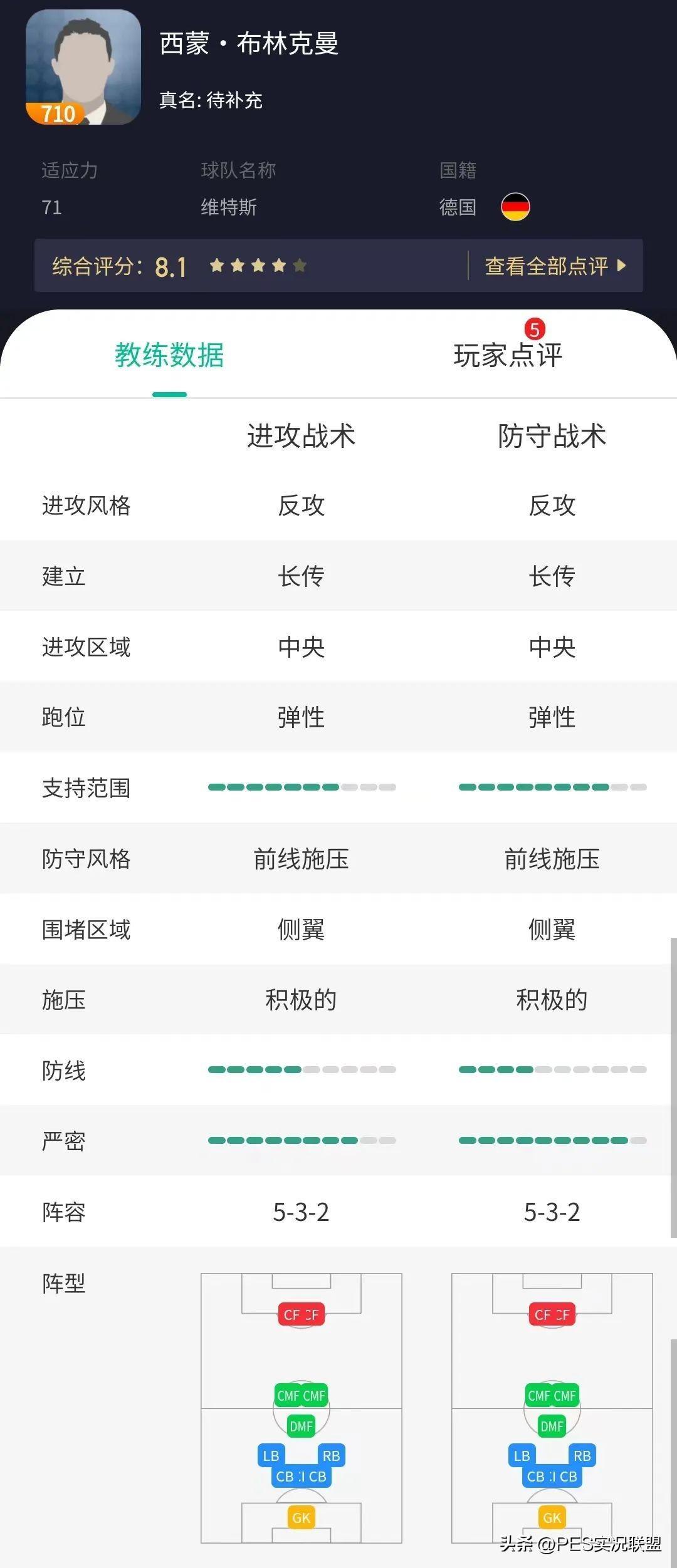 简析:布林克曼是一个五后卫阵型,而且严密等级和支持范围“双高”,再搭配一个中间档的防线等级,明显就是一个中场绞肉机的阵型。