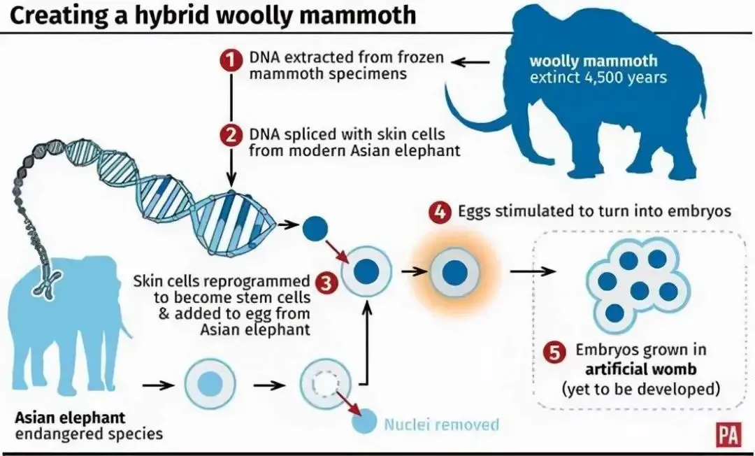 真正的?生物复制需要活细胞,而灭绝动物显然提供不了;但?曲线救国还是可行的:通过基因编辑技术,我们能将灭绝动物的基因与它们现存近亲物种的基因融合,再植入到近亲物种体内,让它们作为?代理孕母生下改造后的物种。
