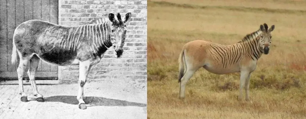 早在 1883 年灭绝的斑驴模样独特,就像是只有前半身有斑纹的斑马,它曾长期被认为是一种独立物种;但南非博物学家莱因霍尔德·劳(Reinhold Rau)分析标本发现它只是草原斑马的一个亚种,那么,让斑驴重现于世理论上就是可能的了——只要选育出后半身没斑纹的斑马就是了。