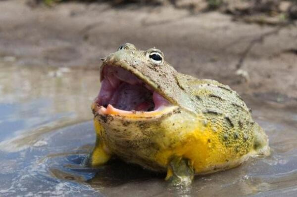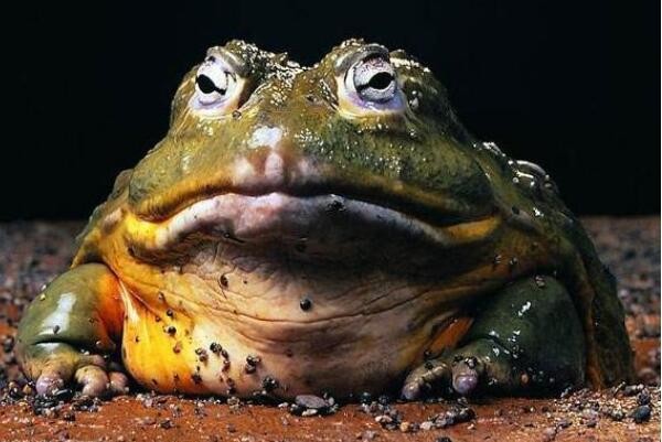 非洲巨蛙这个体长达30厘米,体重月3千克左右的蛙类,是背部皮肤呈绿褐色,腹部呈浅黄绿色的蛙类动物中的巨无霸,而这个喜欢生活在热带雨林中的水源附近的生物,通常在赤道几内亚和喀麦隆附近的雨林中可被发现。