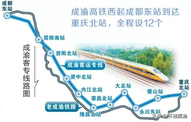 成都至重庆段可利用既有的成渝高铁,由成都东站至重庆北站,设计时速350公里。