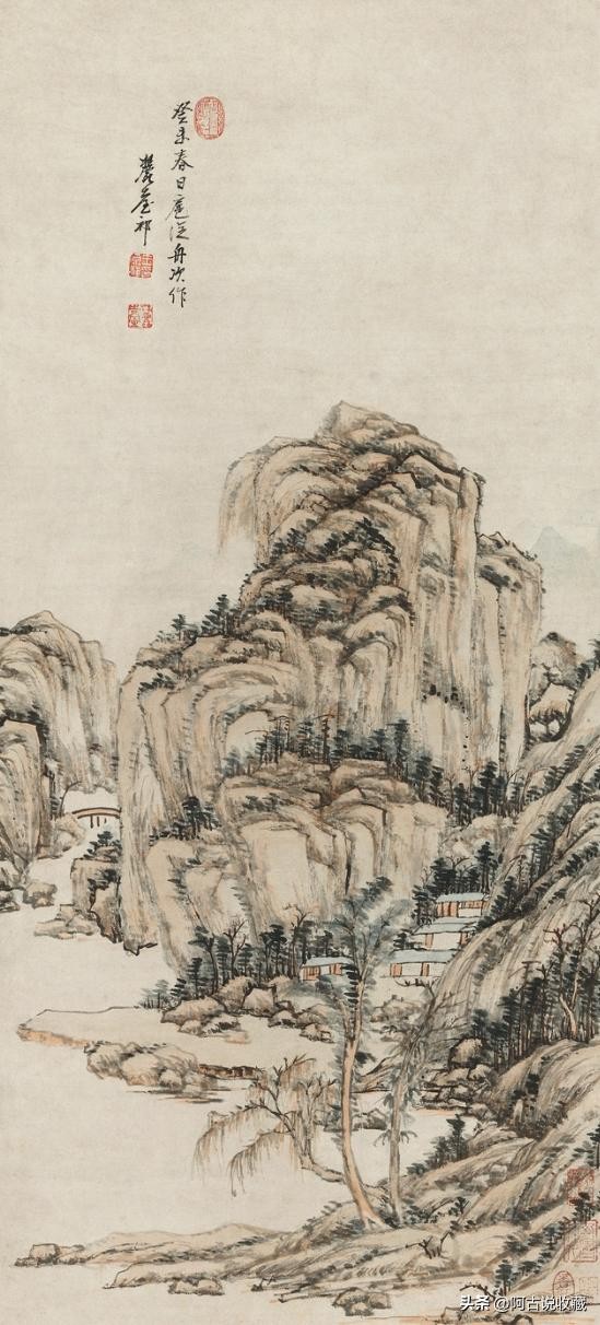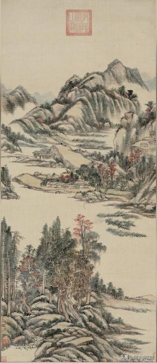 原祁画多水墨,设色者少,而青绿尤少。其浅绛仍法大痴,能得神韵,而青绿晚年多出奇致,朱翠相映,色墨融化,近世黄宾虹最为赏识。此图以浅绛为主,略染青绿,有春山雨过岚翠浮动之感,是其成熟期之佳作。