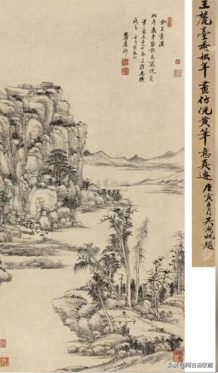 笔墨质朴圆厚,苍然松秀,滋润清越,耐人寻味。与黄公望比,黄氏洒脱逸宕,虚中寓实,淡中有淳味;原祁拙重朴茂,虽实而灵,厚处有清气。异曲同调,皆至极致。