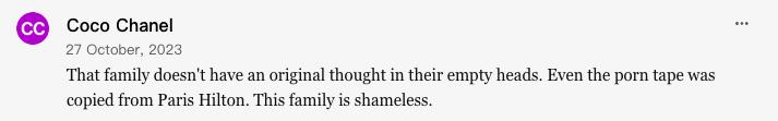 这家人头脑空空哪有什么原创想法,就连录像带事件都是从希尔顿那里复制来的。无耻。