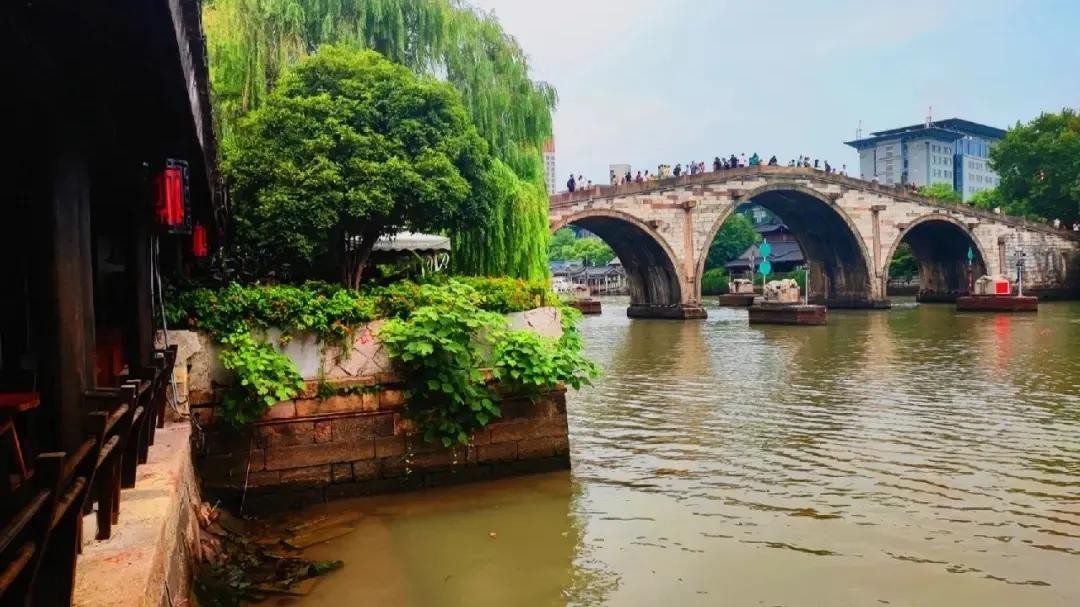 运河中央的“五亭桥”景观,五个亭子结构不同装饰各异,是中国古代桥梁建筑中的珍品。