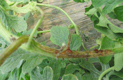 西瓜茎蔓感染蔓枯病,在茎基部呈油渍状,表皮有裂痕,并有胶状物质流出。若气候干燥,胶状物质干了以后,就会变成赤褐色病斑,病斑上会出现许多针头大小的黑点。