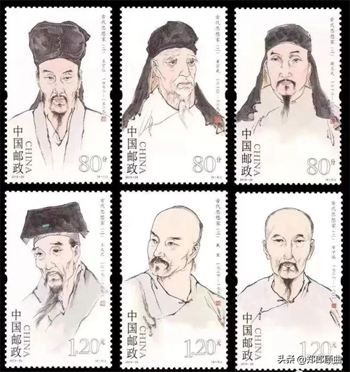 为纪念明清几位著名思想家发行的邮票。上左二起,分别是黄宗羲、顾炎武、王夫之