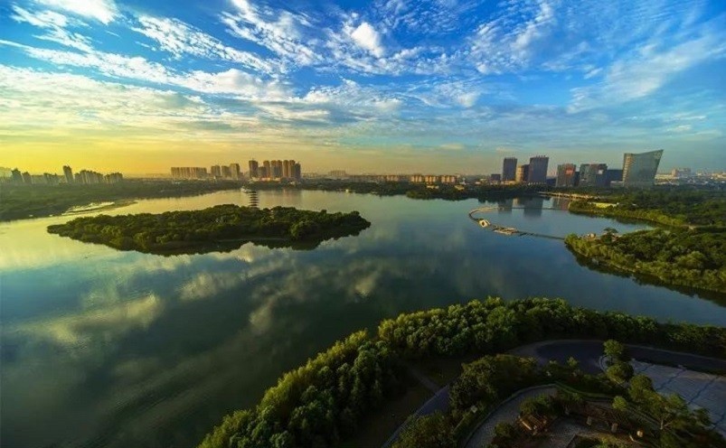 漫步水中栈道,处处是景,远处水天一色,近处波光粼粼。现代化的城市、经济繁荣的张家港,而眼前,则是绿意盎然的暨阳湖,相互掩映中宛若都市里的仙境。
