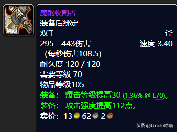 据说这把利斧可以用了外域特有的魔能机甲核心充能打造而成的,所以就叫它为魔能利斧。这把单手斧的话就前期而言还是可以值得拥有的,高秒伤带红色插槽高命中高爆击等级都是非常的NICE值得推荐,推荐指数满天星辰。
