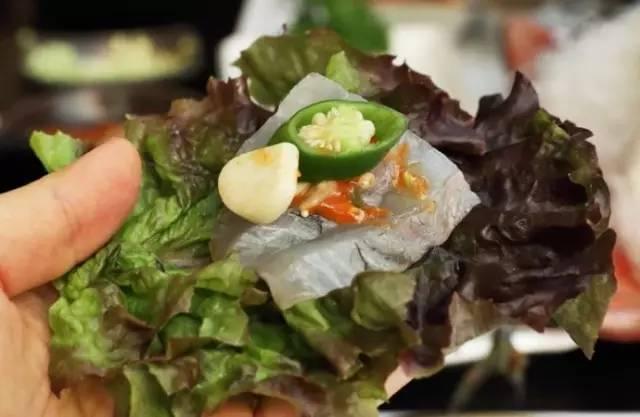 说完日本,来谈谈他的隔壁邻居——韩国。韩国的生鱼片特色是沾上辣椒酱,放在生菜或紫苏叶上,再放上蒜瓣、青椒等,然后包起来入口!而大受欢迎的鱼类有比目鱼、活章鱼、海蛸、螠、鲍鱼等也深受欢迎!