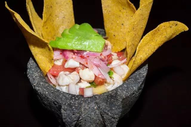 墨西哥虽然不是酸橘汁腌鱼的发源地,但它的生鱼片也有着年代久远的独特风味。不同于秘鲁的做法,墨西哥酸橘汁腌鱼里有多种海鲜,比如,虾、鱿鱼、章鱼,用在玉米酥脆饼包起来。