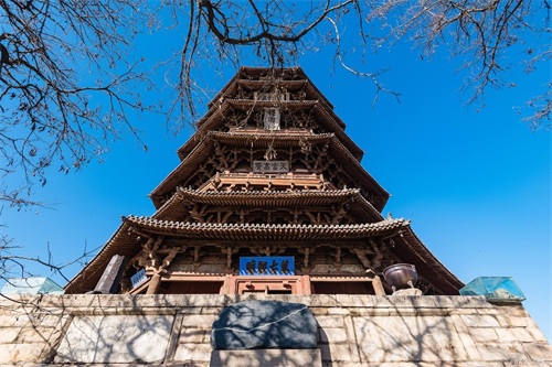 全塔高67.13米,直径30.48米,呈八角形,共五层,结构精巧,造型庄重。塔内分为两层,每层都有八个屋檐和八个角梁,每个角梁上都有一个铜铃,风吹过时,铜铃会发出清脆的声音,给这座古老的木塔增添了无限生机。