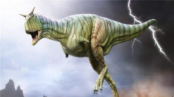 食肉牛龙,它的名字就足以完全概括它的整体形态,头顶上方有犀牛一样的牛角。它的速度可以赶上我们现在公路上车速为六十迈的小轿车,被称为跑的最快的肉食恐龙。