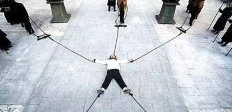 这种刑罚就是在人的四肢和头上系上绳子,再把五根绳子的另一头拴在五匹马上,最后五匹马往对应的方向跑,这时犯人就会因为强大的拉力而被分尸,样子非常惨烈,光是想想就觉得非常恐怖。人在被撕裂的时候是不痛的,因为在撕裂之前的拉扯时人就已经被疼休克了,所以后面已经感觉不到疼痛了……