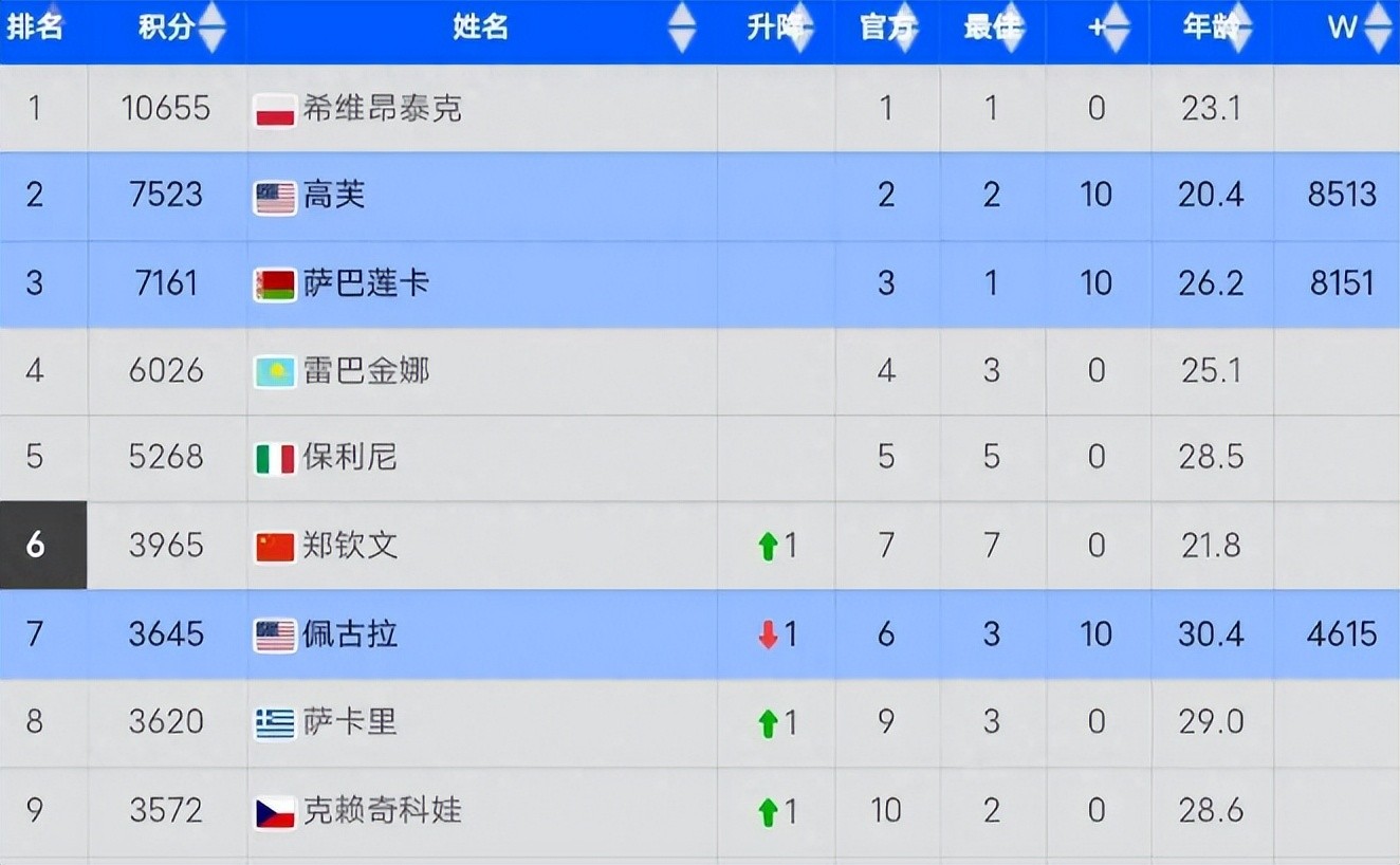 网球女单最新世界排名:斯瓦泰克排名第1 高芙稳居第2 郑钦文高居第6
