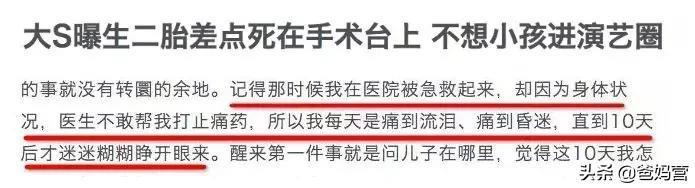 而生二胎儿子的时候,大S已经40岁了,当时她因早产+止痛药物过敏,导致癫痫发作,重度昏迷10天,住进了ICU。在鬼门关上走了一遭,抢救2次才活过来。