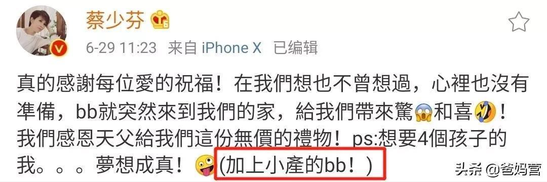 大部分人都只知道,蔡少芬和张晋有2个宝贝女儿,加上现在新怀上的,一共是3胎。但其实,蔡少芬曾经流产过一个孩子,而且是37岁才好不容易有的第一胎。所以蔡少芬却一直默认自己家有4个孩子,尽管一个孩子住在天堂。这一点瞬间戳中了很多人心里最柔软的部分,因为不管发生了什么,孩子对于妈妈来说:存在过,即深爱。