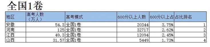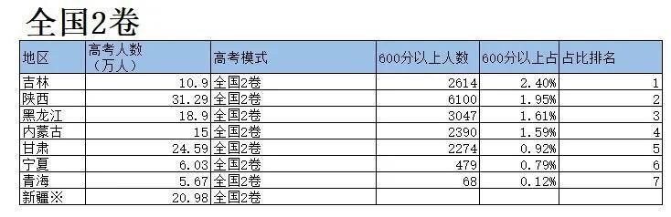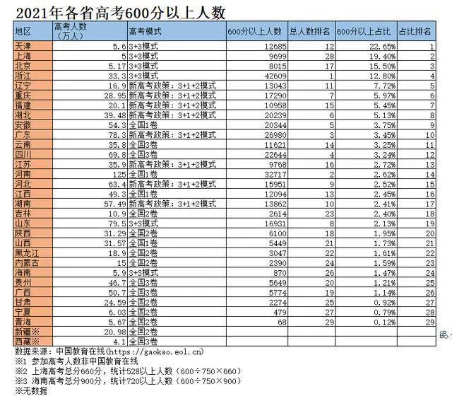 2021年高考,600分是一个重要的分数线,我们来看下各省实力如何。天津600分人数占比达到了22.65%,这是一个令人震惊的数字,也就是说5个人中有一人以上能够考到600分以上,第二名上海因为总分是660分所以统计的是528分以上的人数,达到了19.4%,第三名北京15.5%,平时我们的印象是北京学子用很低的分数就可以上985,211,事实并不是这样,分数竞争也是很激烈的,看来北京的孩子不仅综合素质高平时也很努力学习啊,前三名都是直辖市,省排名最前的是第四浙江,然后是第五辽宁,这些成绩也反映了当地对于教育的重视。数据如有错误欢迎指正。