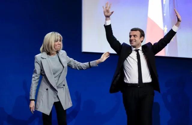 马克龙在法国总统竞选中胜出,左是他的妻子布丽吉特