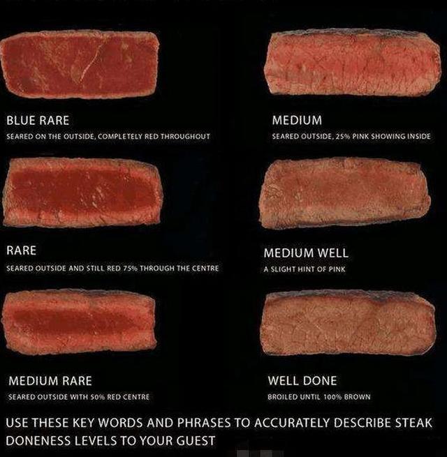 英文看不懂是吧,不要紧,反正你就记得国外的牛排不是用1、3、5、7、全熟这几个数字分的,不知道来中国后哪位有才的人给翻译成这样。